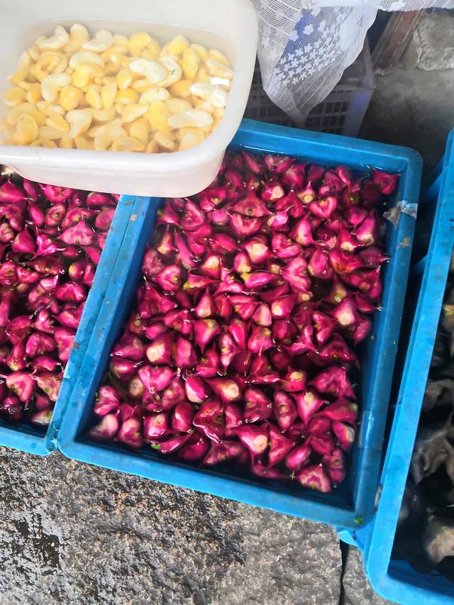 第一次见新鲜的菱角原来是红色的,以前一直认为是是绿色或者黑色的