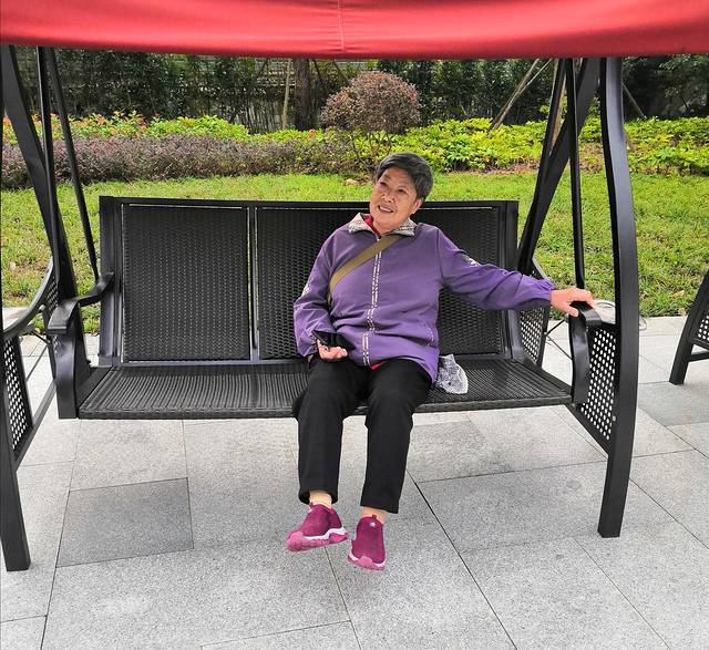 老妈兴致未减坐在景区的摇椅上乐开怀