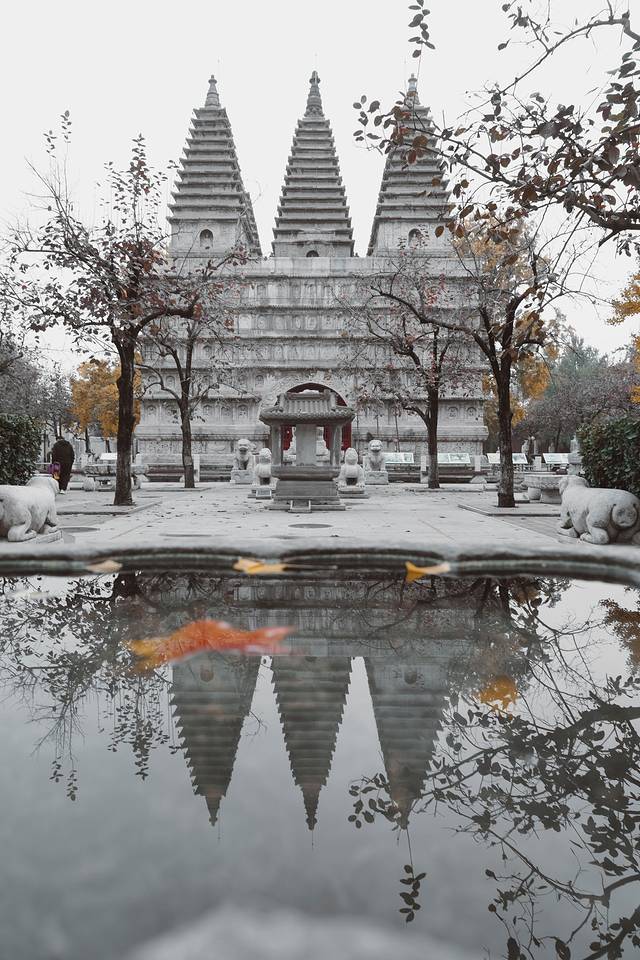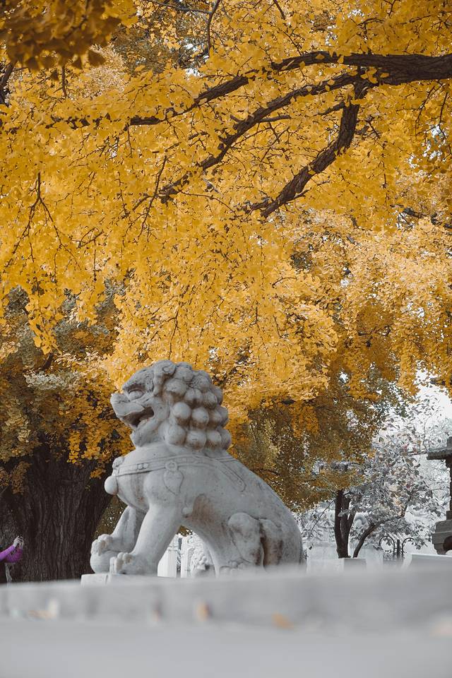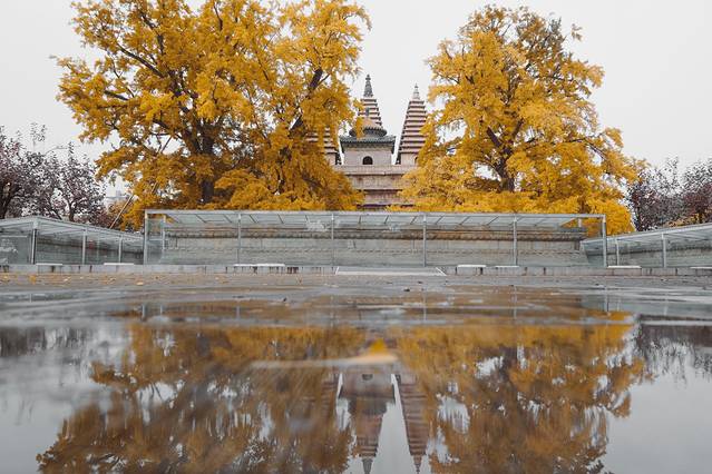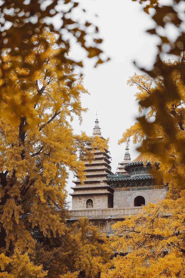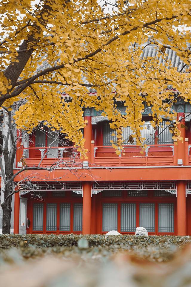 金黄的银杏叶和赭红的古楼相得益彰,一眼望去竟有种时空错乱,梦回千年前的感觉。