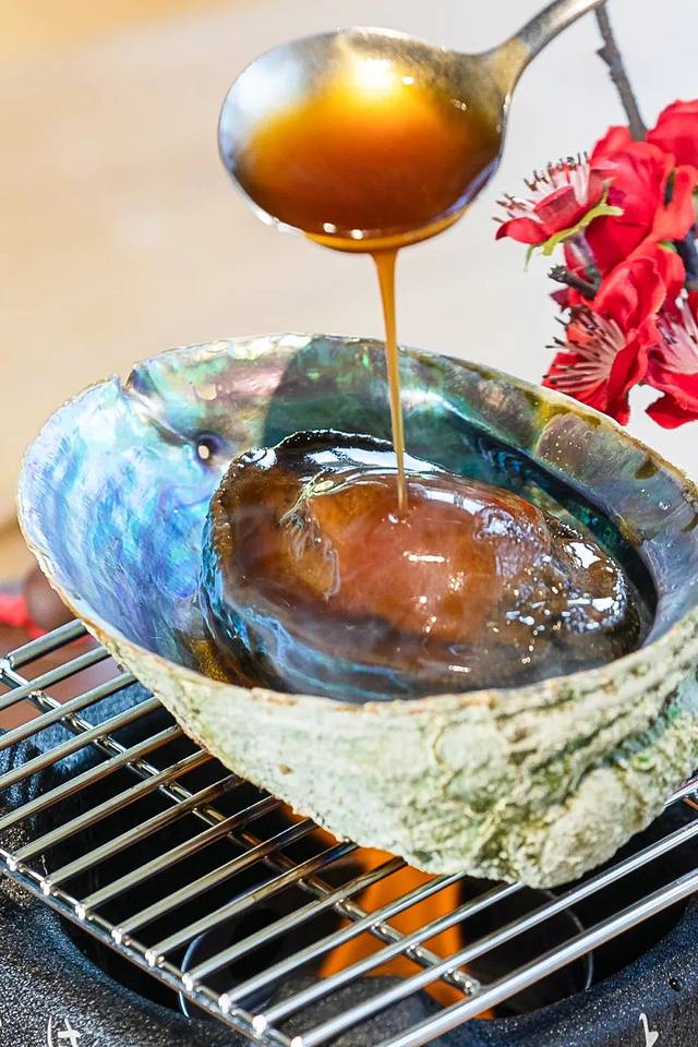 清热滋阴、营养丰富的鲍鱼,经过大厨创新烹调,用老母鸡、金华火腿等多种原料熬制二十小时左右,再秘制炭烤,浓郁香口。