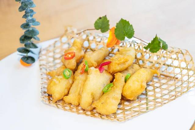 椒盐肚富鱼,无骨鱼肉经过油炸后,表皮金黄香脆,趁热咬一口,外酥里嫩,鱼肉吃起来像豆腐,椒盐咸香盈满,越嚼越有味。