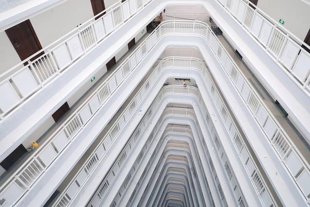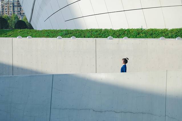 从上往下拍整栋楼的构图,也是最佳的角度。同时可以使用对称拍摄,使三角对称,拍摄的效果充满了几何对称美感以及异次元的科幻感,具有很强的视觉冲击感。