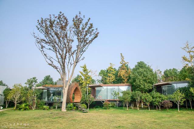 破坏森林的一草一木,在森林中搭间房子,让民宿与森林融为一体,回归大自然的生活如此美好。房间里180度的落地窗就是一幅画,透过落地窗,洋湖湿地公园的美景映入眼帘,蓝天白云之下,十余栋造型简洁的深灰色地球仓掩映在花朵与绿树之间,与周围的环境融为一体,从自然中来,又回归到自然中,道法自然天人合一。