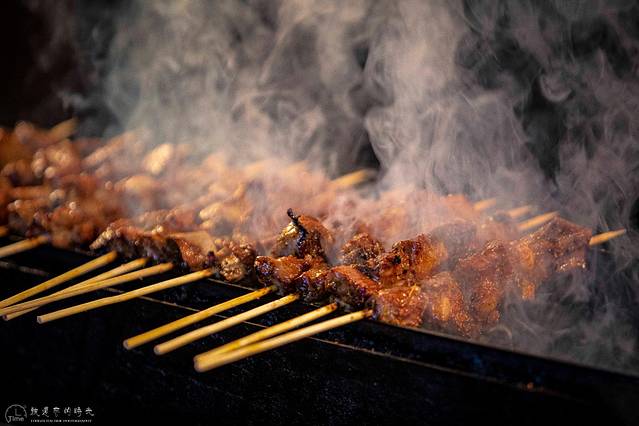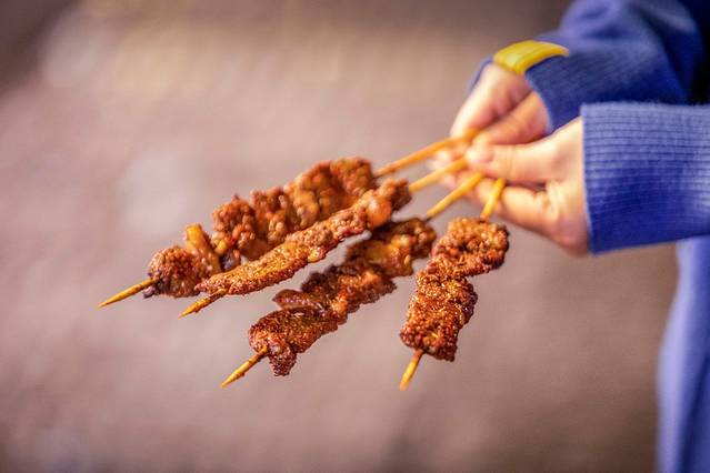 在炭火中一烤,油滋滋的牛油回流浸润到里脊肉中,撒上辣椒粉、孜然粉滋滋肉香扑鼻而来,正哥的牛肉串口感细腻又不失嚼劲,一口咬下去,牛肉本身的嚼头和孜然、辣椒的香味浑然一体,一串接一串根本停不下来。