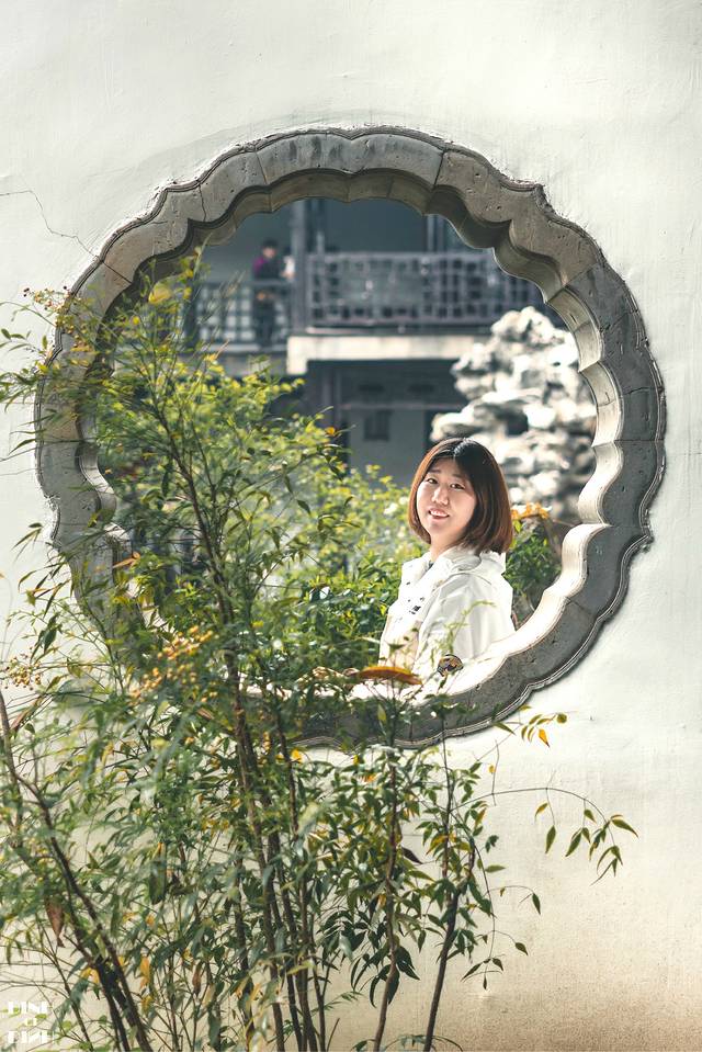 逮着水心亭里的人少,在正对水心亭的梅花窗站好,留个纪念
