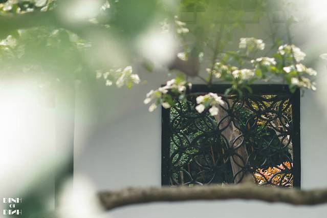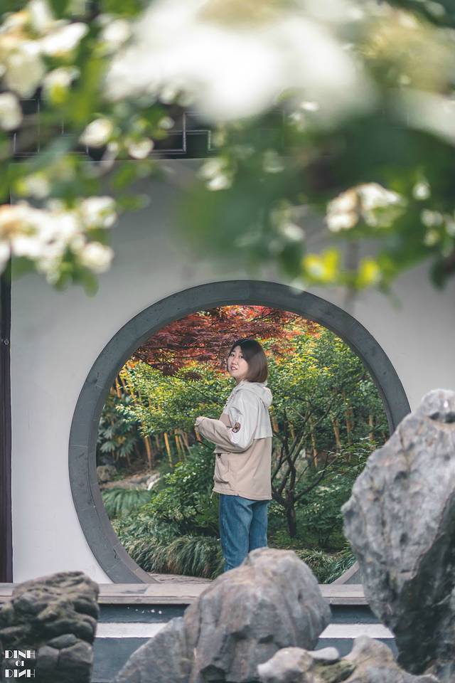 院子里有一棵琼花,是 扬州 的市花,开得正艳,正对着一个月亮门,真的太美了,于是等了好久人来人往中见缝插针,终于拍到了。