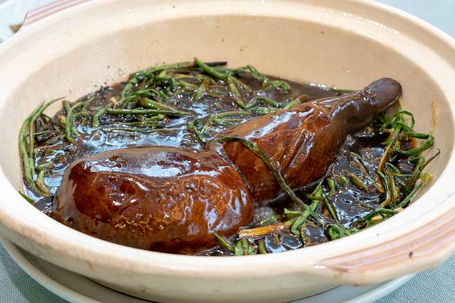 八宝 葫芦鸭摆盘似鸭非鸭,端上来的时候淋上酱汁,锅已经烧得高温,倒入的酱汁立马沸腾,还未开吃,这一个仪式感就勾起了我浓浓的好奇,服务员把鸭子切开才发现,师傅已经给鸭子去骨,想必工序应该及其复杂,在鸭肚中填入拌好佐料的糯米,香糯口感入味十足;