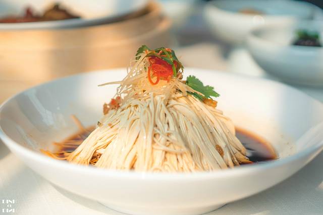 淮扬烫干丝:干丝被堆成一座山一样的形状淋上开水祛除豆腥,控水后浇上味汁,拌一拌爽口的美味就做好了;