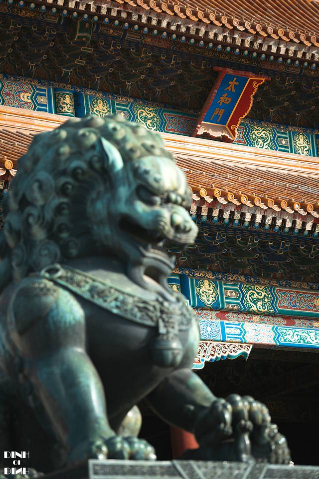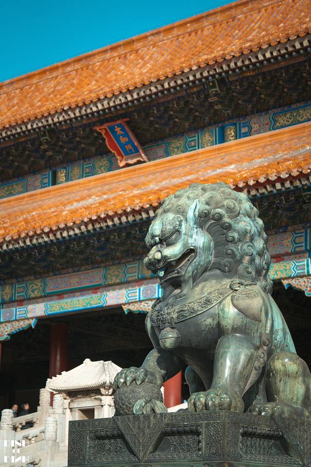 每个带你游览紫禁城的导游,都会和你讲解太和门前的两座狮子,东边的是公狮子,踩着一个球,西边的是母狮子,踩着一个小狮子。而这两座狮子也是拍摄太和殿的好位置。