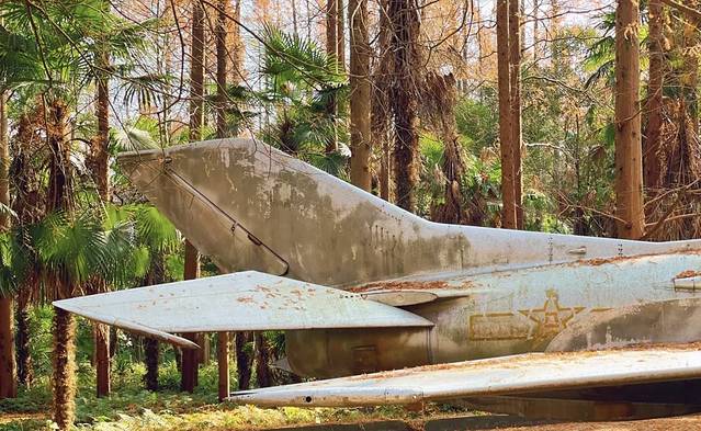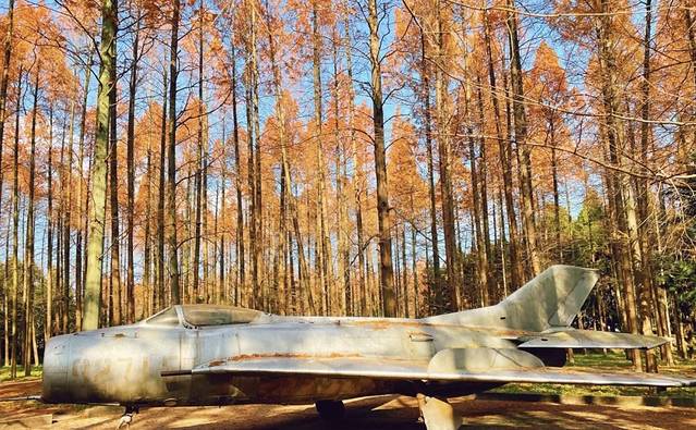 这两年最吸引人的是沉睡在水杉林里的废弃歼-6战斗机,进园区后右拐直走能找到。这曾是中国第一代超音速战斗机,服役时间最长,战果也最辉煌,直到2010年6月才正式退出中国空军装备序列。