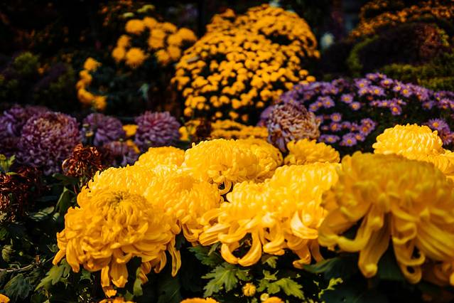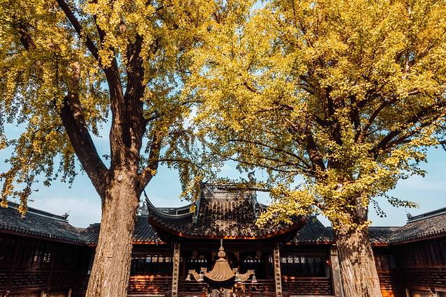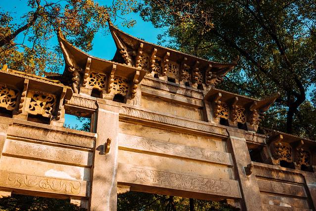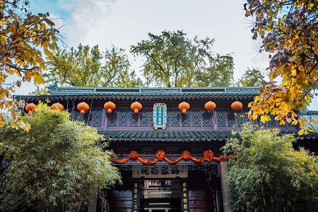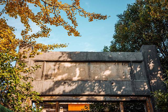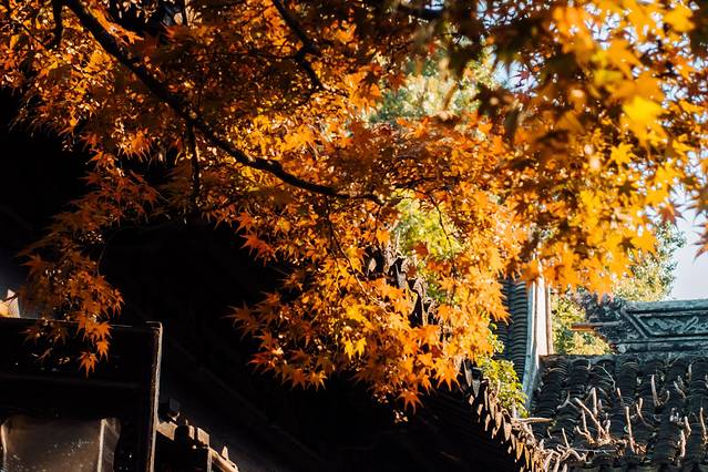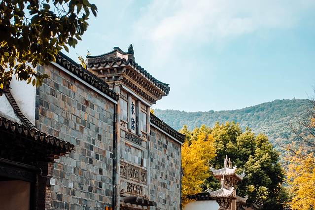 门前立有四面牌坊,而秋季的红枫叶更是增添魅力