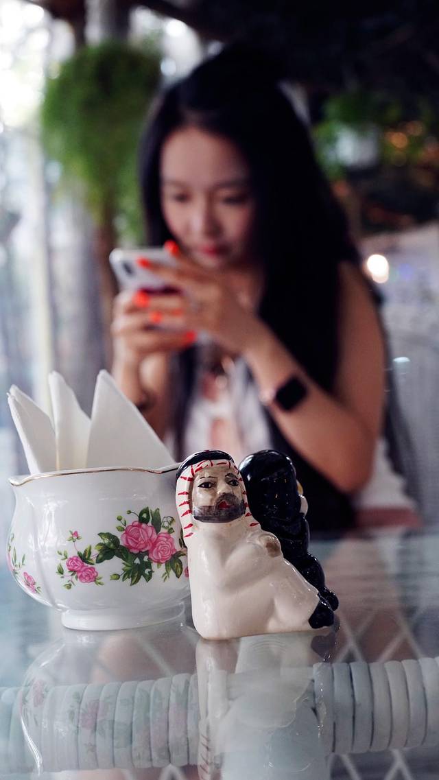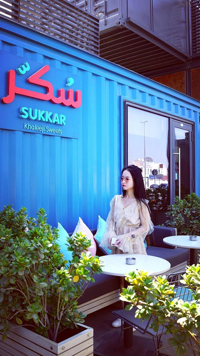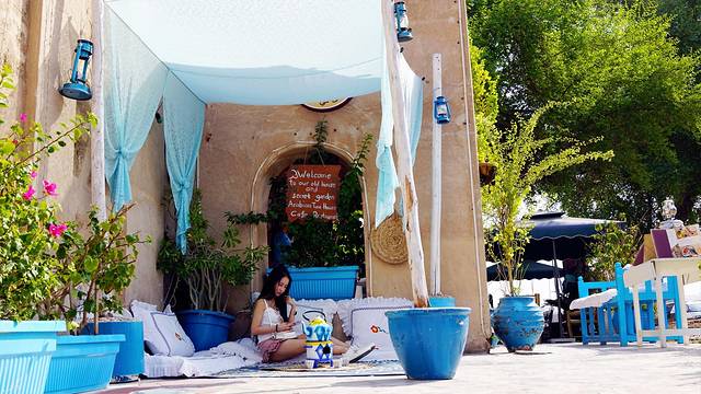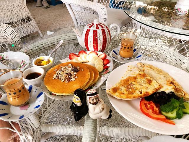 就是这家网红餐厅:Arabian Tea House Café,蓝白相间的装修,地上铺满鹅卵石,餐厅很大,有室内和室外,不过这温度室外可坐不下去