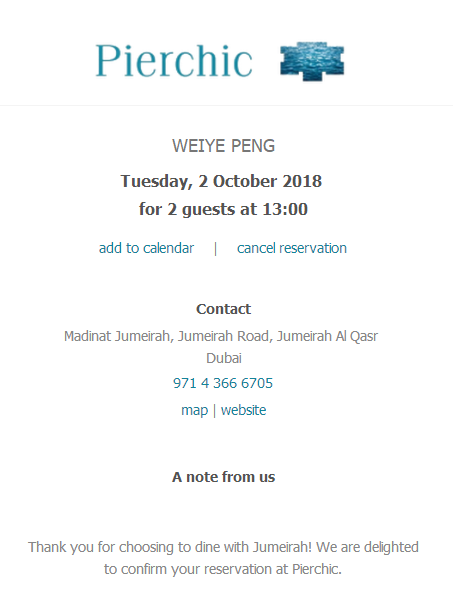中午去事先在官网上预定好的Pierchic 餐厅吃饭,餐厅前一天还会在发邮件和你确认第二天是否会来