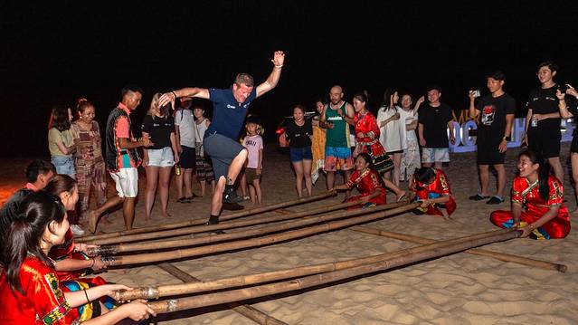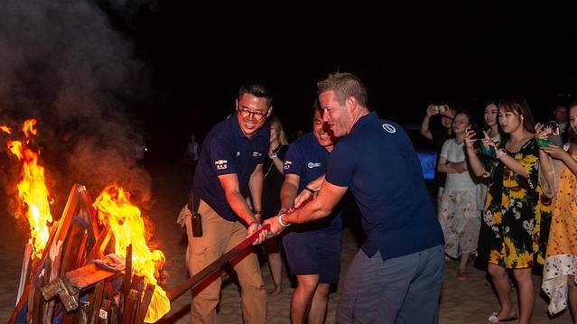 评比结束后,Andy为晚宴点燃了篝火,所有人围着篝火跳竹竿舞,不亦乐乎!