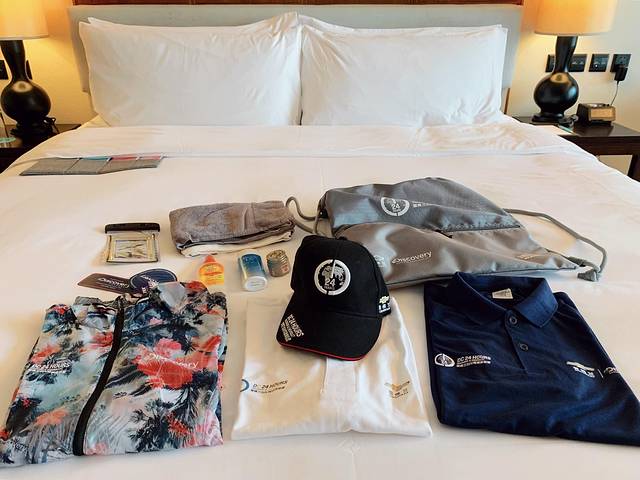 一进酒店,映入眼帘的就是这次活动方给准备的装备,里面装有2件T恤,1件Discovery的迷彩防晒服、1顶帽子,1套毛巾,还有驱蚊液、手机防水袋、防晒霜、清凉油等,所需的设备一应俱全,太贴心啦。