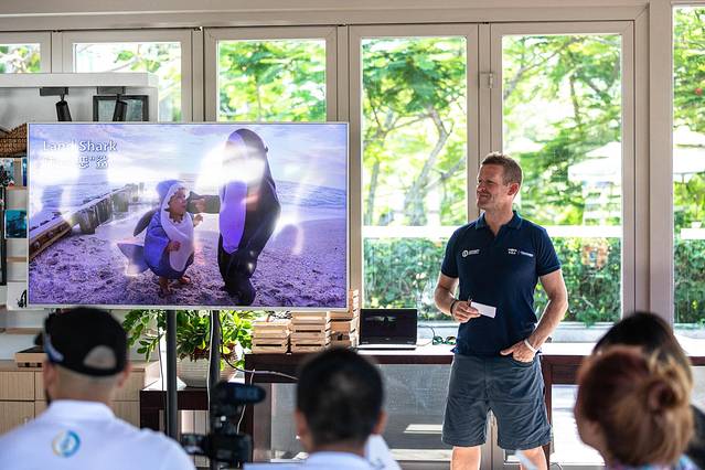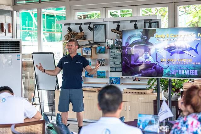 Andy分享说到,他在Discovery的每一次拍摄过程都充满了未知与挑战,即使屡屡遇险,但都化险为夷。从事鲨鱼拍摄20多年,经常在海底无保护介质无铁笼隔开的情况下拍摄,但至今没有被鲨鱼咬伤过,能够四肢健全地站在这里和我们交流~他说:“他对鲨鱼的痴迷已远远超过对它的恐惧”。
