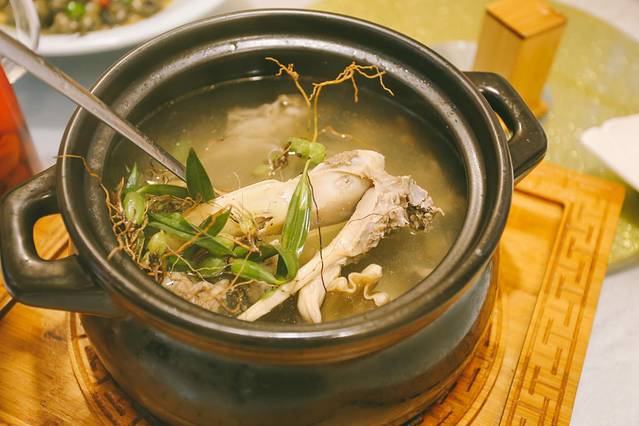 我们点了几个当地的特色菜:岚谷砂锅鹅,炒鲜笋,清蒸红眼睛鱼,酸辣龙爪菇,竹荪筒骨汤。