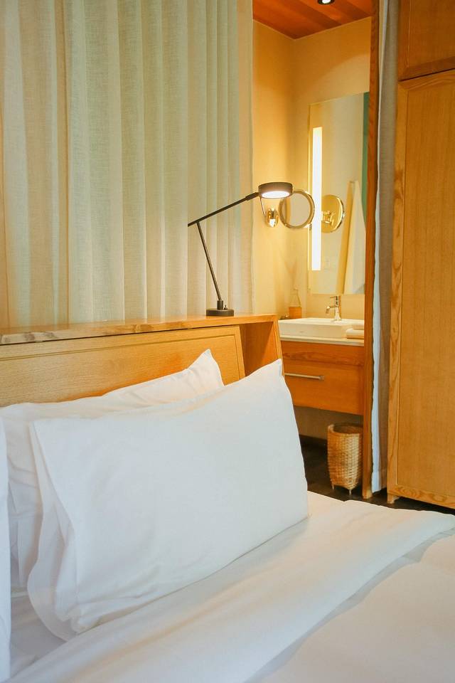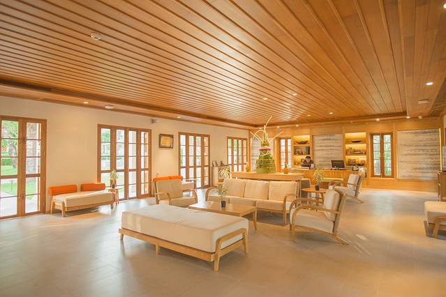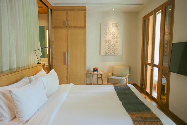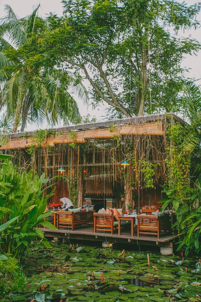 整间酒店是以原木色和白色为主色调,没有东南亚随处可见的繁复的花纹和装饰,简单高级。映衬在绿色的大叶植物之中,非常有安缦的风格~