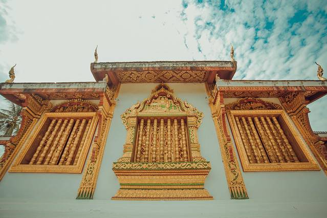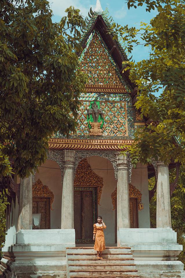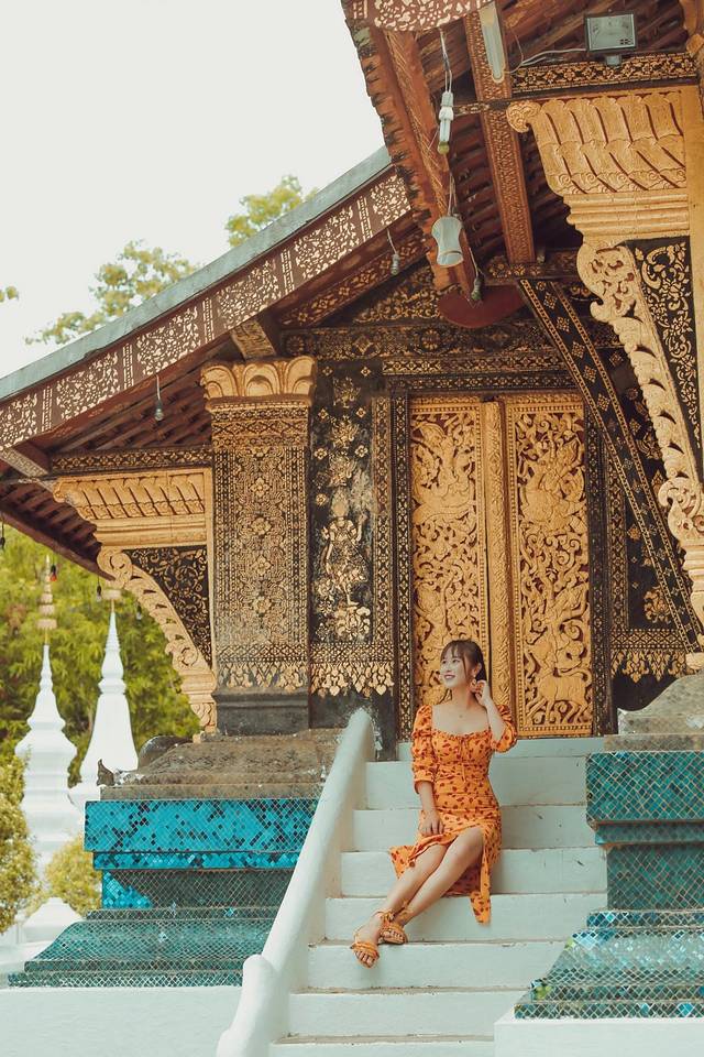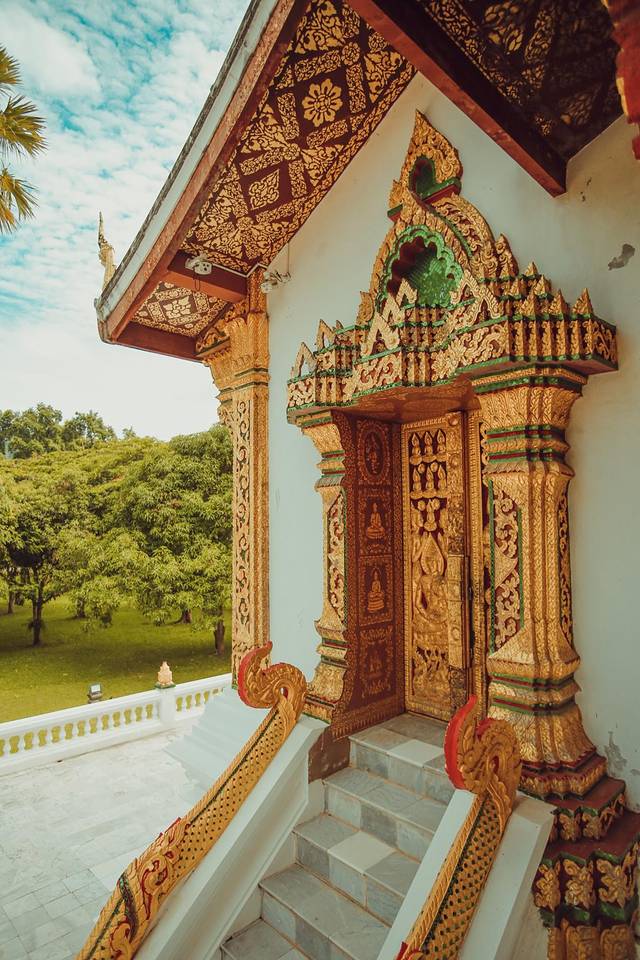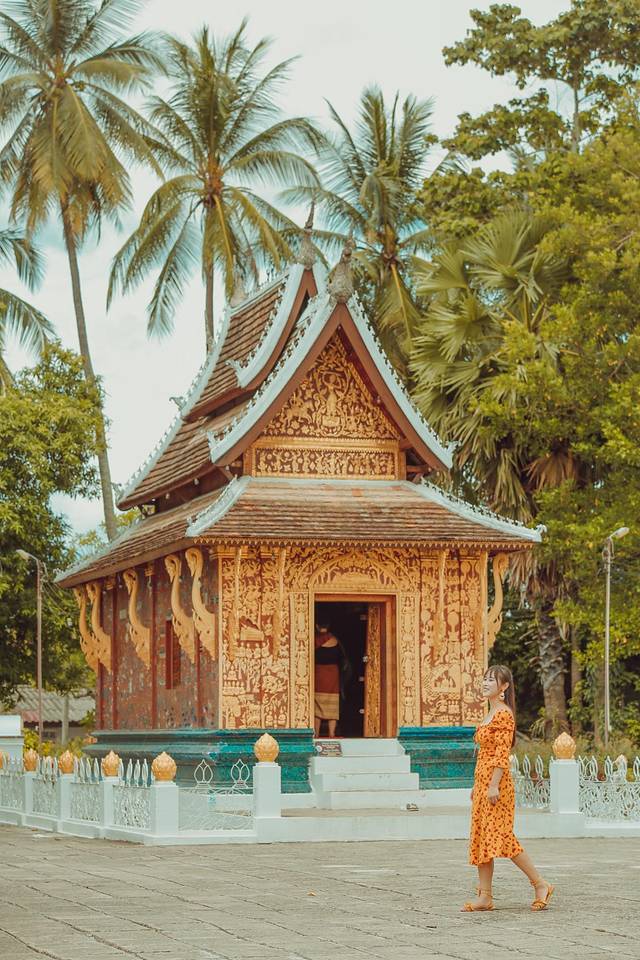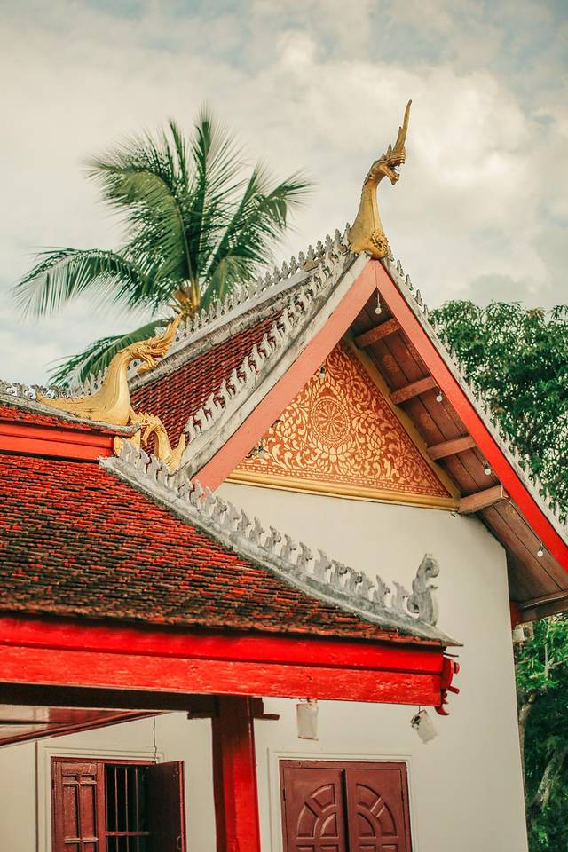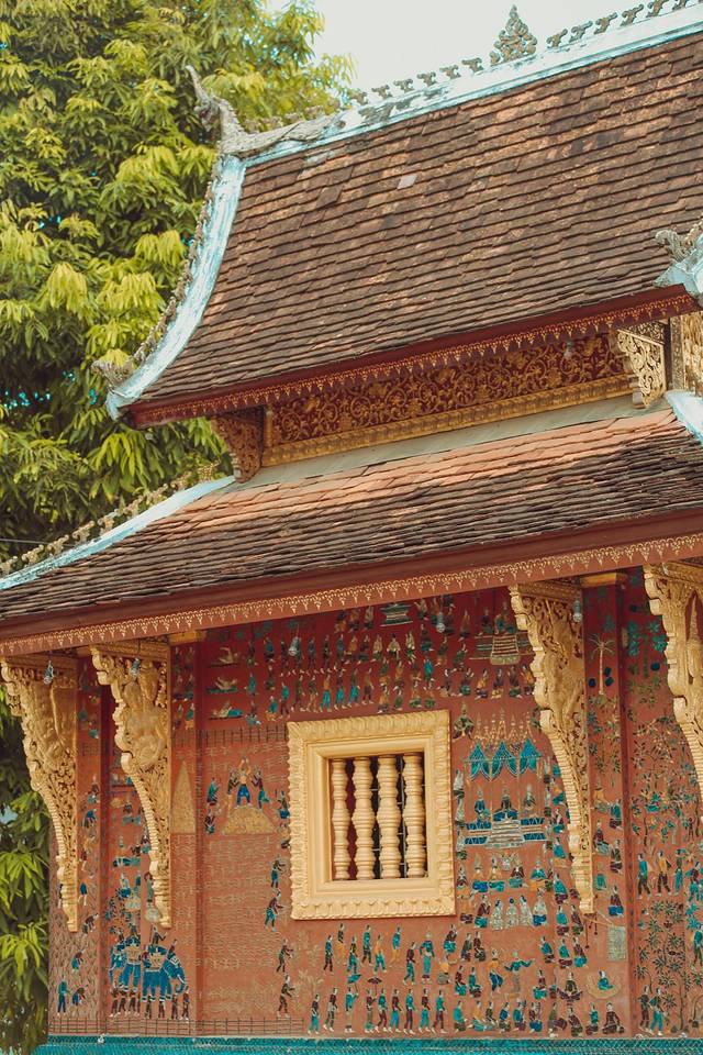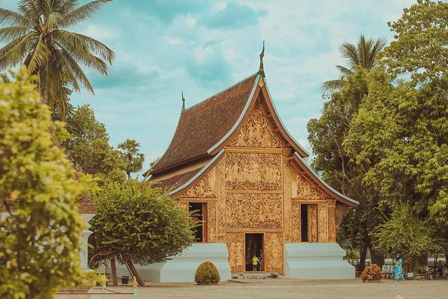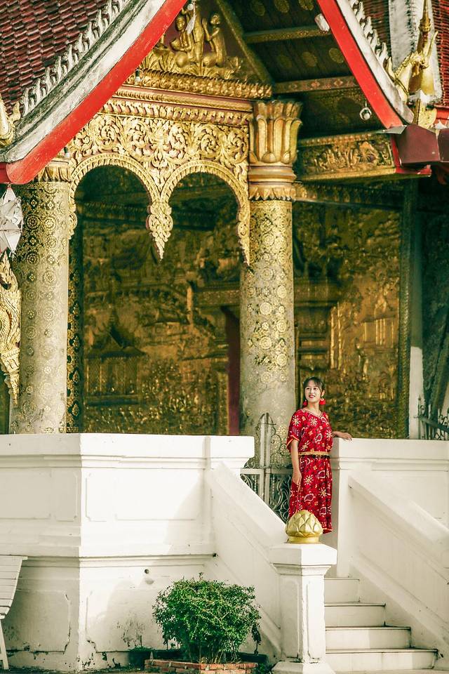 迈佛寺的佛殿屋顶是典型的琅勃拉邦五层木质结构风格,有装饰精美的木柱和华丽的鎏金浮雕。