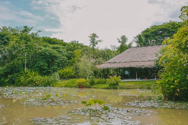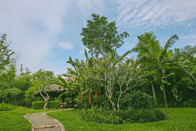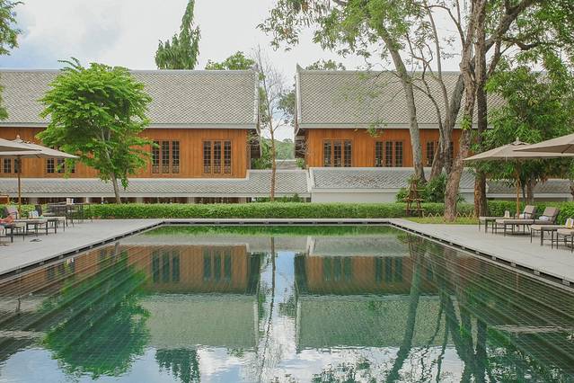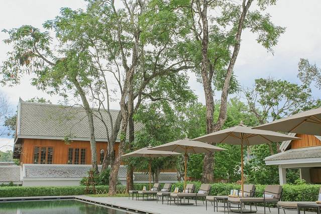 酒店一棵20米gao的百年榕树,是游泳池畔的主要景观,其他遍布酒店区域的一些现存树木,大多是浅色叶的果树,像印度软木、龙眼、芒果、椰子树和火焰浮力树等,随机种植的方式让它们看起来更像是原本就生长在这里的。在通往公共道路的连接空间,还随处可见老挝国花:鸡蛋花。