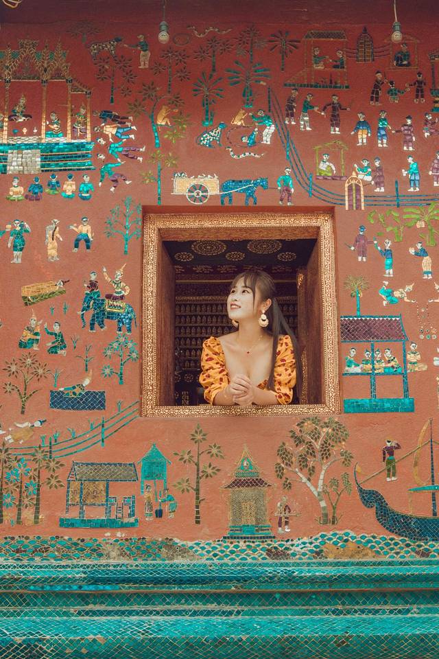 红色的外墙上用很多蓝色、粉色等各种色彩的马赛克,拼贴出活泼生动的老挝乡村生活场景,还有老挝名著中的英雄人物西约沙瓦的勋绩,这些彩画是香通寺在1957年为了纪念佛陀涅盘2500周年增加上去的。
