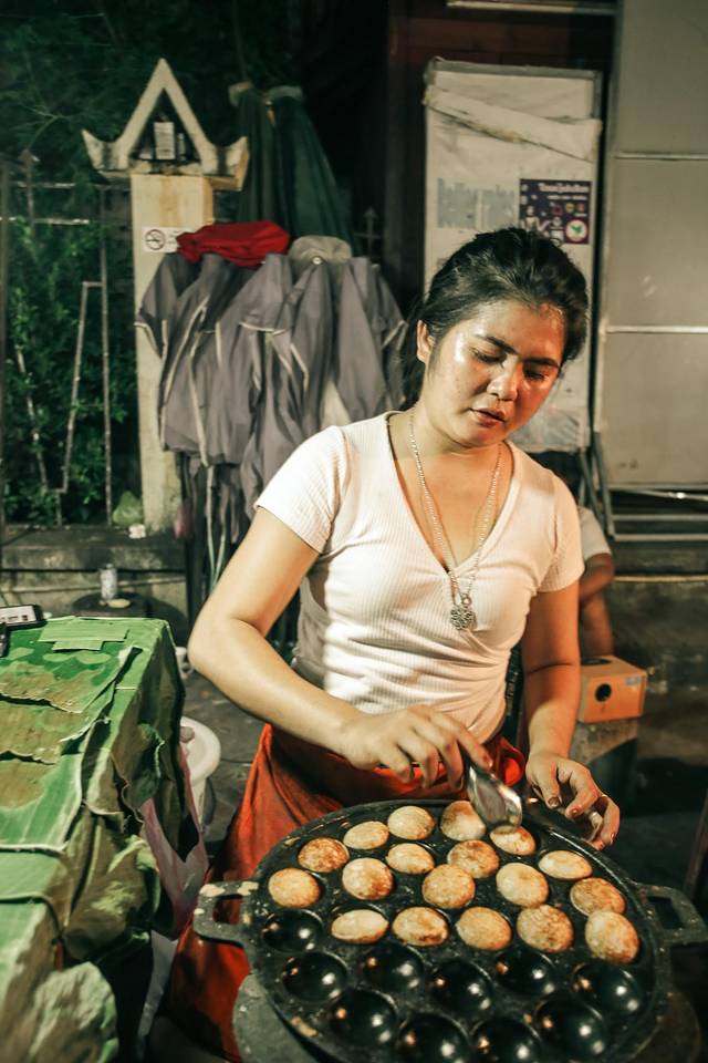 --小吃Kanom krok。由椰奶,糯米,糖和米粉制成,将白色液体倒入带有小圆形模具的铸铁盘中。出炉时,将两半夹在一起形成球体。这个在老挝的夜市随处可见,从锅里滚烫出炉时味道最佳。