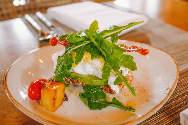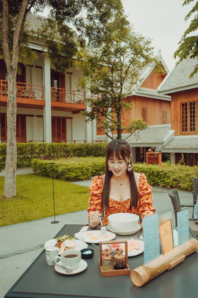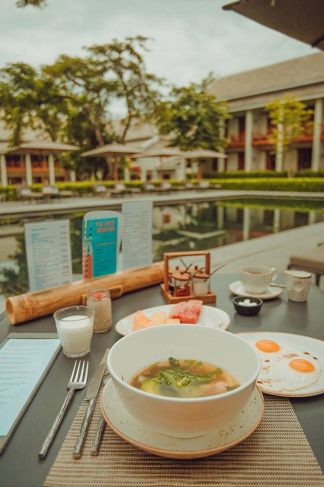 结束了布施活动,我们走回酒店吃早餐,早上气温凉爽,我选择了坐在泳池边的绝佳景观位置,美滋滋。