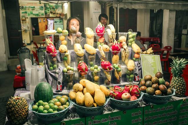 --饮品。老挝的水果种类很多,夜市上最热门的当属各种水果shake,我在老挝每天都至少会喝两杯mango shake,超赞!像其他菠萝、山竹、西瓜也不错哦~