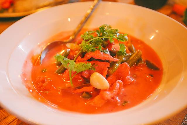 这一道汤是椰汁红咖喱猪肉,口感很特别哦,好吃。