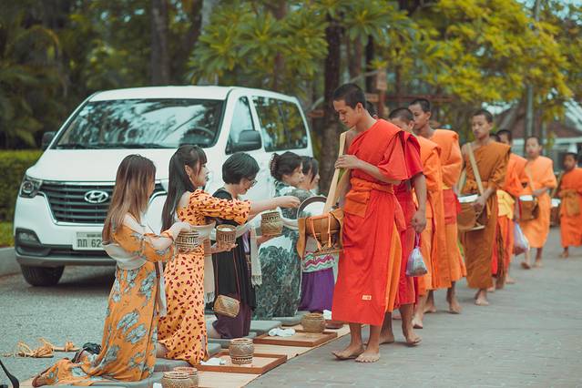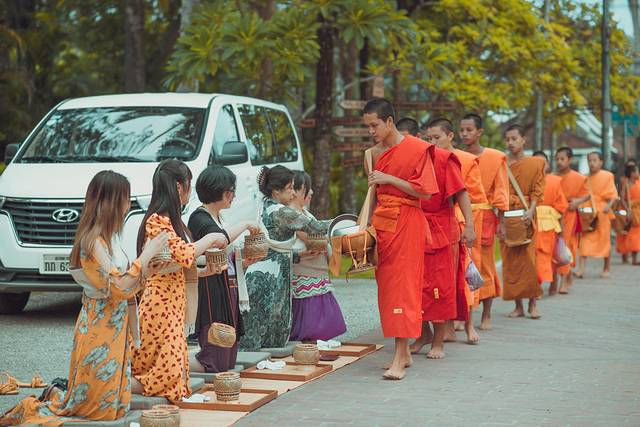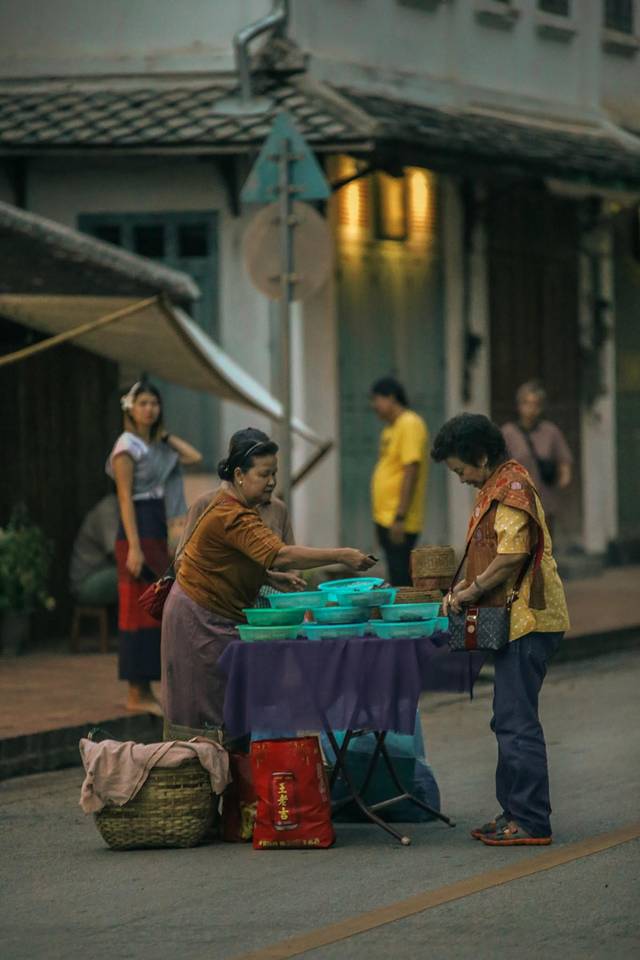 信徒沿途跪坐,奉上糯米饭。不过随着现在琅勃拉邦布施仪式的逐渐商业化,许多游客已经不再是跪坐,而是坐在塑料小板凳上完成布施。