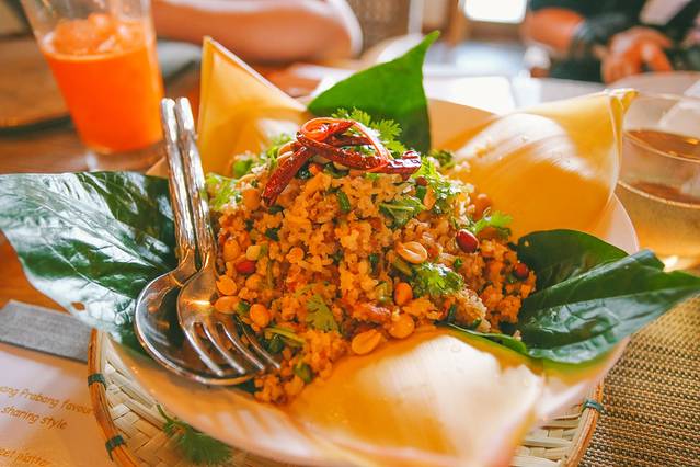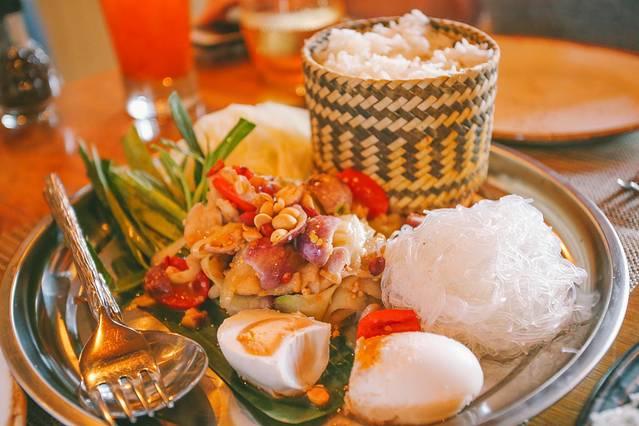 --糯米饭。老挝人民比其他任何国家都吃更多的糯米饭,糯米饭在他们的文化中根深蒂固,他们被称为“luk khao niaow”或“糯米的孩子”,老挝米饭通常盛放在蒸熟的竹筐中。