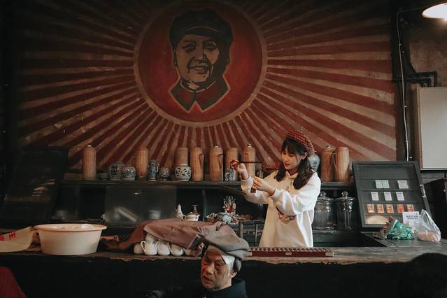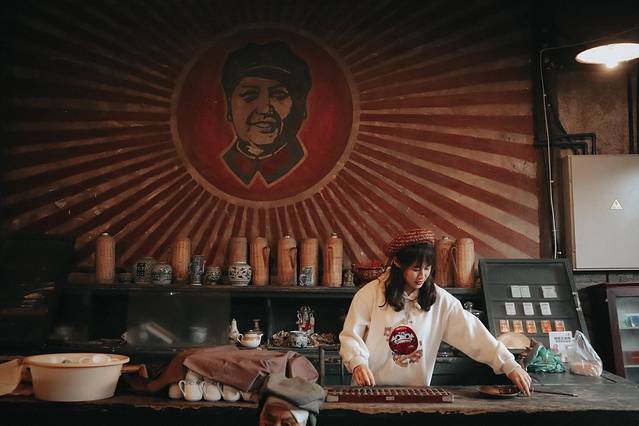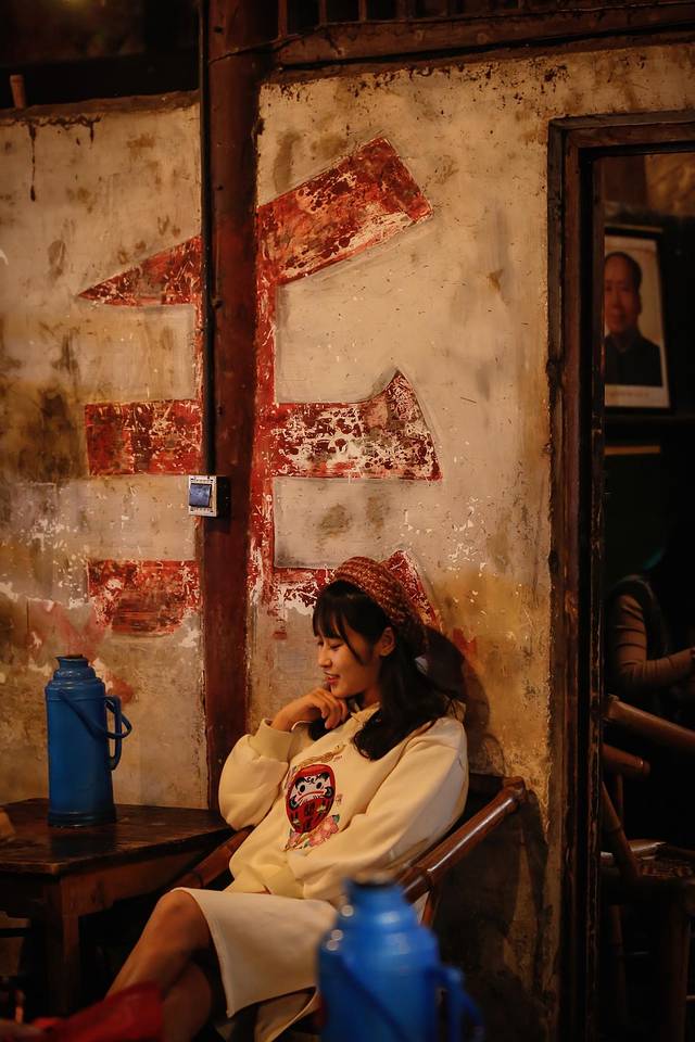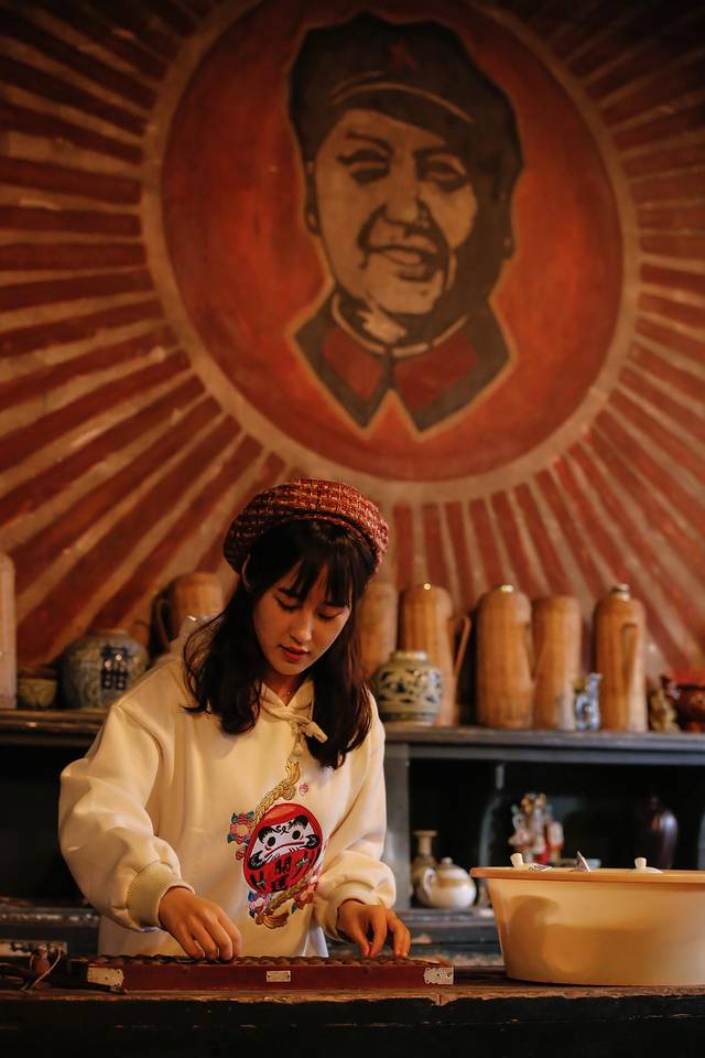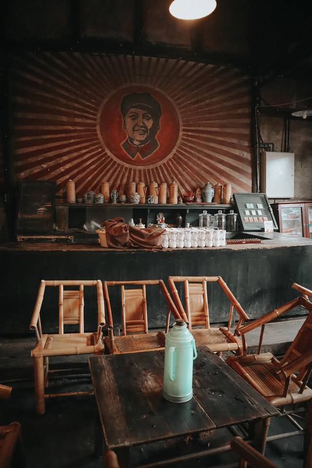 茶馆正面墙壁上有一副巨大的毛主席画像,画像周围全是大红字写的毛主席语录,屋檐下那颗闪闪红星,即是一个时代的缩影,也是历史的沉淀,仿佛在诉说着那个年代故事,总能唤起我们对特定时代的许多记忆。