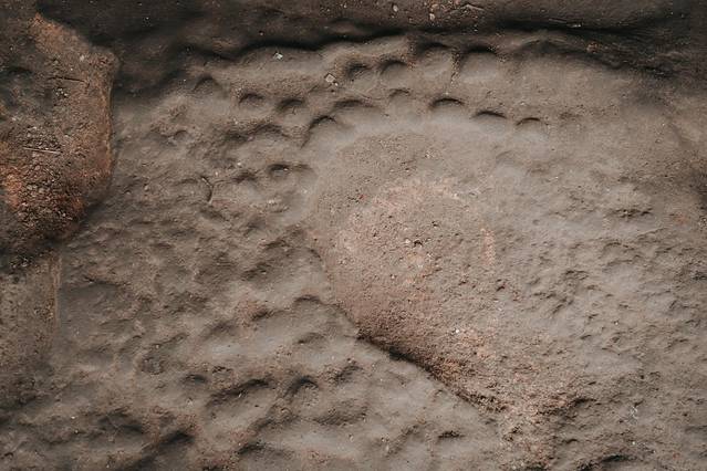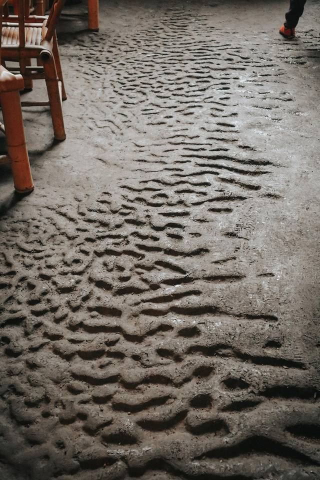踱步进入茶馆,中间通道上凸凹不平的“千脚泥”,布满过去的痕迹,显露着遒劲有力的态势。
