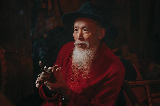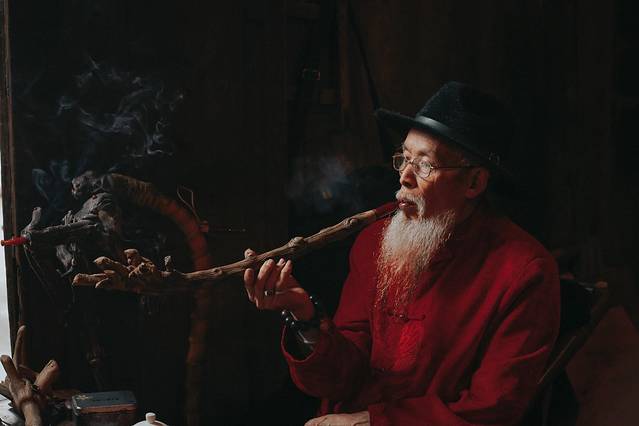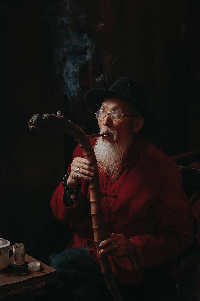 这位罗朝荣老爷子是茶馆的美髯公,他擅长做烟斗,常坐在茶馆大门口。他面对镜头自然、生动,是摄友们最青睐的好模特。