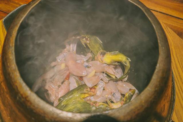 接着把新鲜的鱼肉直接放在锅底的鹅卵石上,我除了点了三角峰鱼,还要了一份牛蛙,都是一起倒入的。