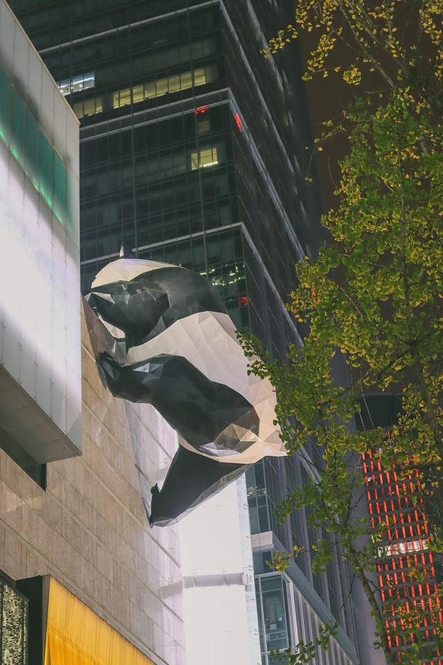 这只由三千多块三角形构件组成的大熊猫,其设计师爸爸Lawrence Argent为其取名为: “I Am Here”。