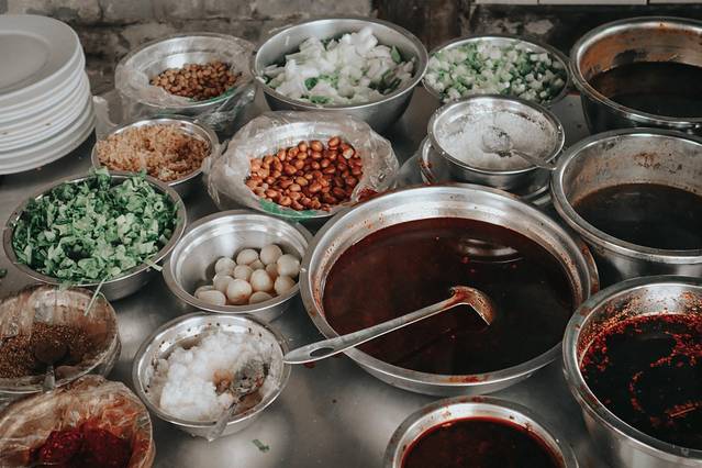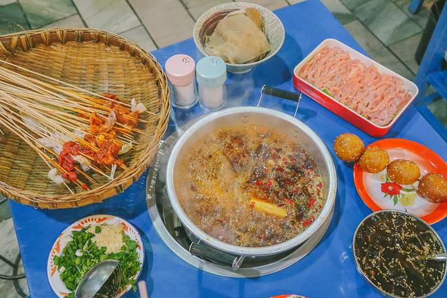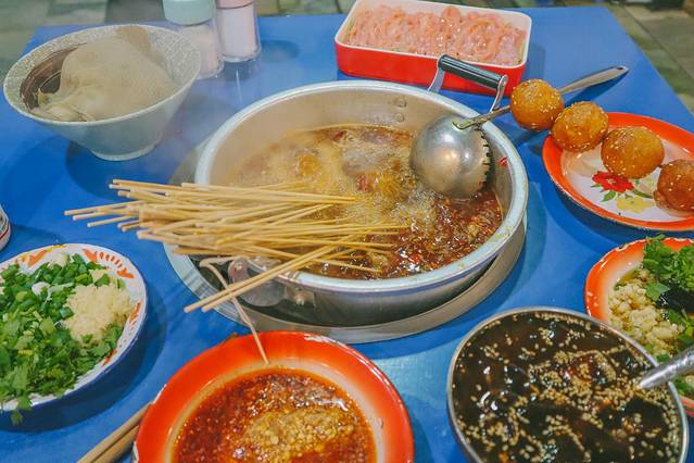 把一大把串串放进滚烫翻腾的卤水中,“吱吱吱”的声音刺激耳膜,扑鼻的香气萦绕在空气当中,让人馋的直流口水。干碟里有辣椒面、花生碎等等,烧开锅底后,先要给自己拌一份料碗,舀上一勺浓汤,与干碟搅一搅和一和就可以蘸着肉、菜大口的吃了。