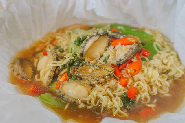 里面的食材很丰富,鲍鱼的个头又大,数量又多!它其实也算得上是一道主食,除了鲍鱼,还有方便面、蟹肉棒、丝瓜……汤汁鲜美,口感极好。