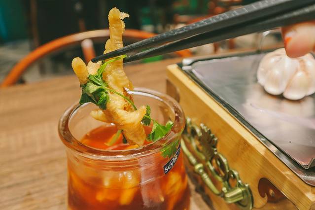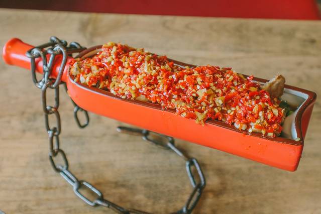 绝情蛙,鲜艳的出品。蛙肉放置于酒瓶形状的盘内,用链条做支撑。上面覆盖着满满的红剁椒,看着就很爽。蛙肉很嫩,带有一些酸辣的口感,非常开胃。