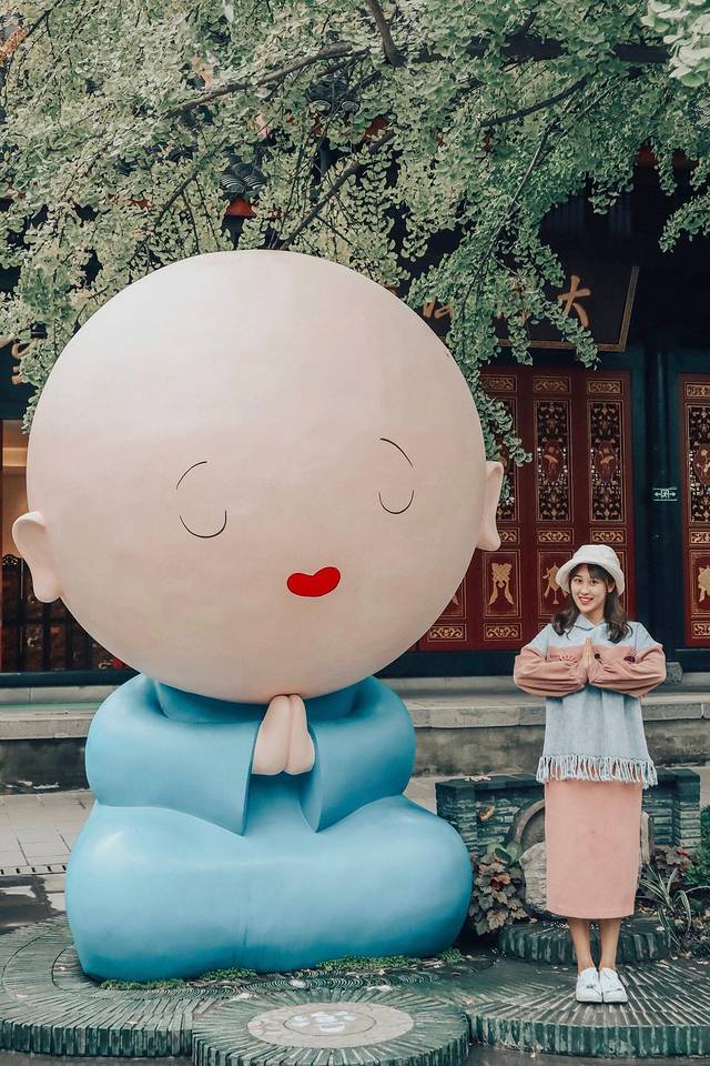 而大慈寺最吸引我的,当属这位萌萌哒“圆一”小师傅了~僻掉多年饱受诟病的烧头柱香习俗,大慈寺另辟蹊径,卡通化小沙弥“圆一”,可爱至极,而且显得非常新潮,让这座千年古刹瞬间变得活泼起来。