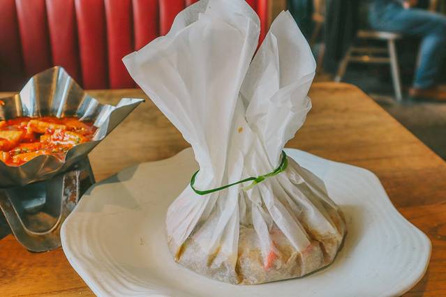 纸上焗鲜鲍是另一道招牌菜,上桌时是由一张可食用的特制纸张包裹起来。