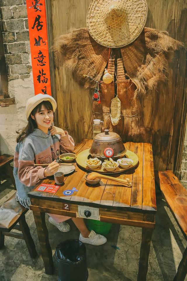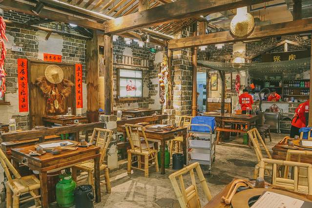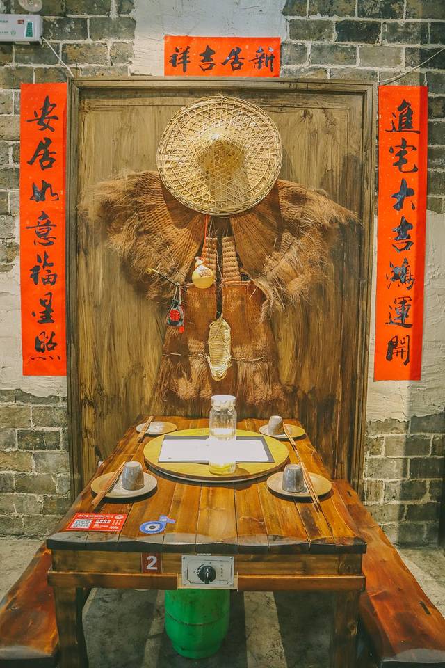 渔网、斗笠、蓑衣和小船把氛围衬托了起来,像是走进了小渔村,点几盘今天新鲜捕捞的鱼虾,很有老旧的成都市井味道,亲切又热闹。
