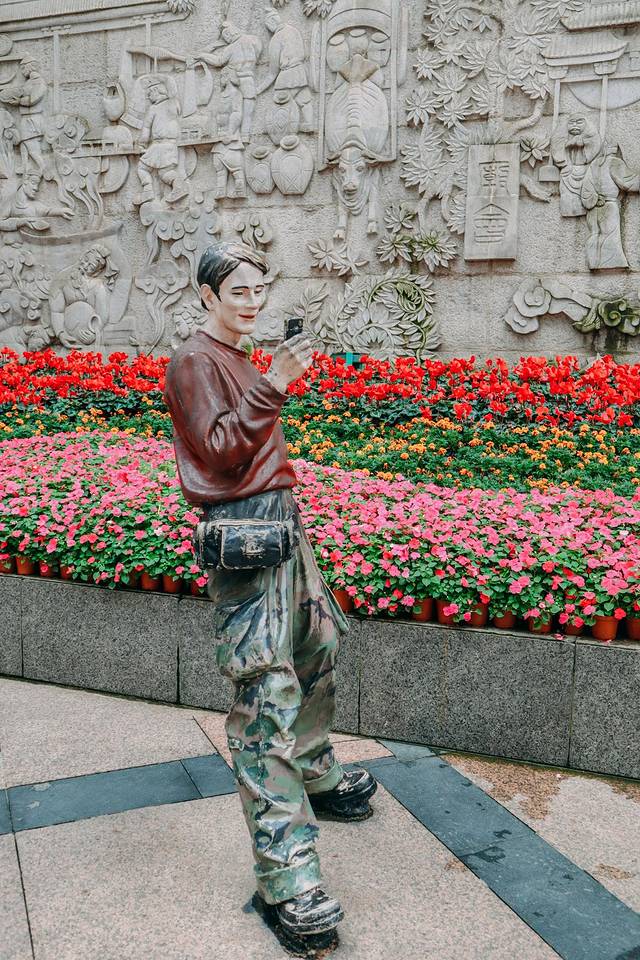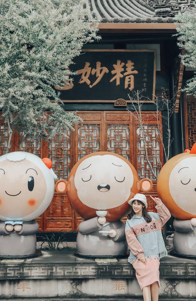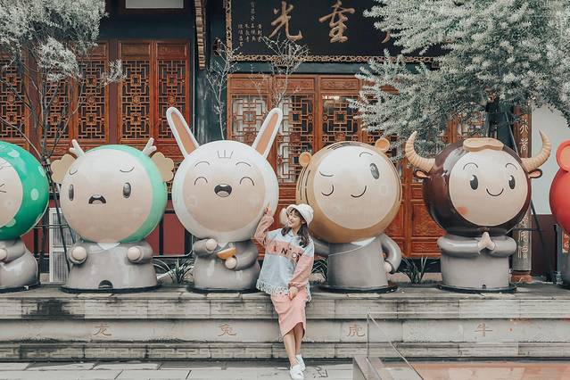 大慈寺一共引入了14尊巨型卡通和尚,全部身穿灰色的僧衣,除了两座人形的小和尚(一座是圆一,另一座现在已经被搬走了,可惜),其他12座则是卡通的12生肖和尚,十足卖萌。