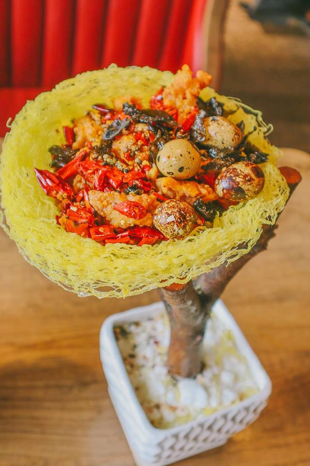 雀巢掌中宝这道菜的摆盘真的相当相当有特色,真的做的像个鸟窝一样,下面是树枝和花盆。鸟巢中的鹌鹑蛋很入味,掌中宝吃起来嘎嘣嘎嘣脆,每一口都是回味。