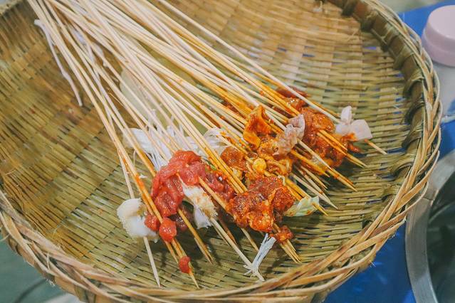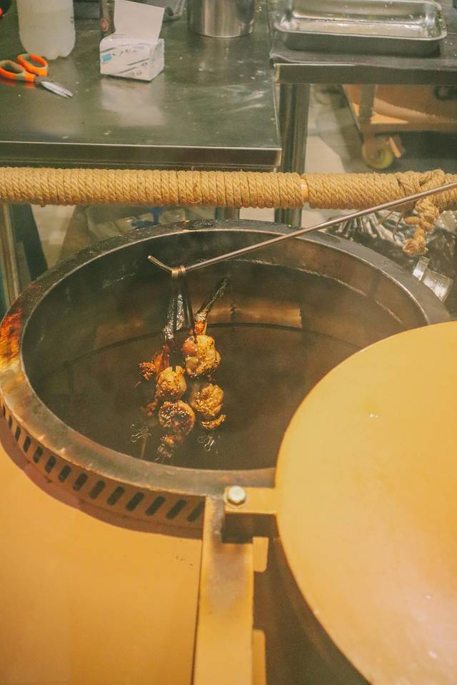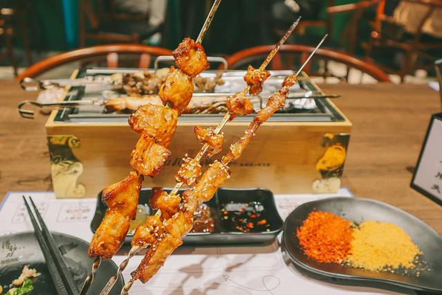 而焖烤是将腌制好的各种肉串挂在高温的大缸内,盖上盖子,利用锅底炭火的温度,将大缸内部肉串焖烤至熟的。千万不要小看这个焖烤过程,火候和时间的把握非常关键,少一分则不熟,多一份则肉老,是非常考验厨师功夫的。