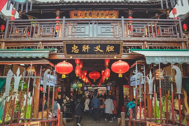 成都的锦里古街,青瓦错落有致,青石板路蜿蜒前行,这里汇聚了茶馆、戏楼、酒肆、手工作坊、工艺品店……热闹亲切,令人流连。