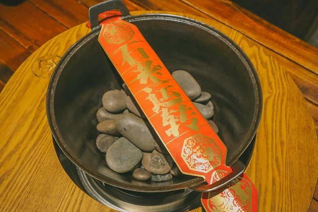 他们家的做法是先把加热到滚烫的鹅暖石用作石锅铺底。