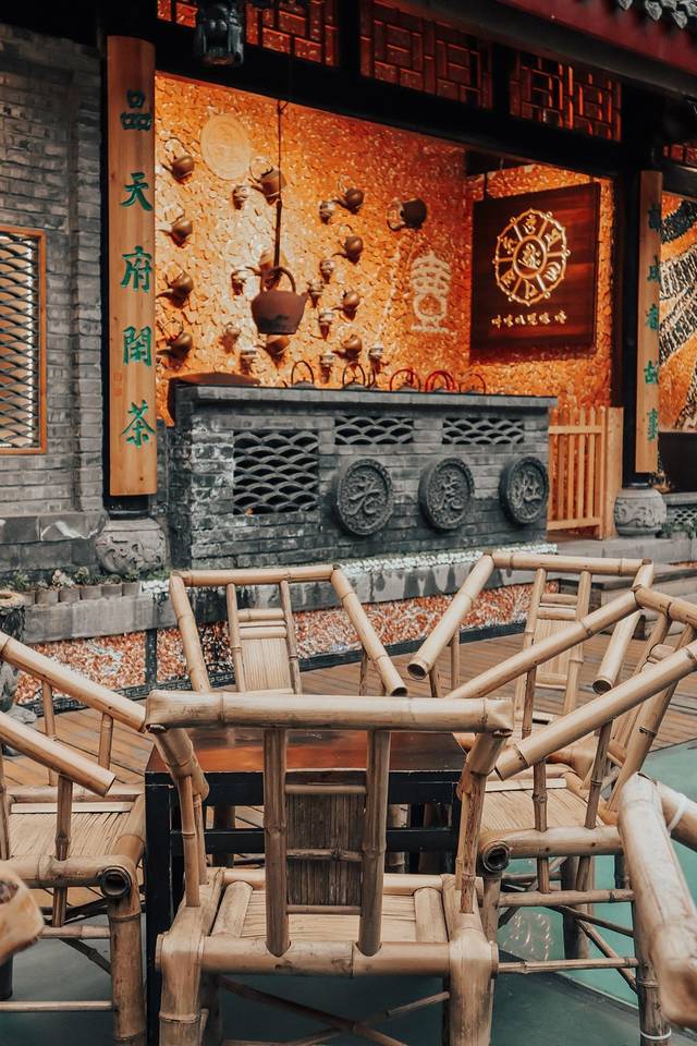 茶铺里放置了很多木式桌椅,一眼看过去就很有老成都的感觉,很能感受到老成都的茶馆文化。