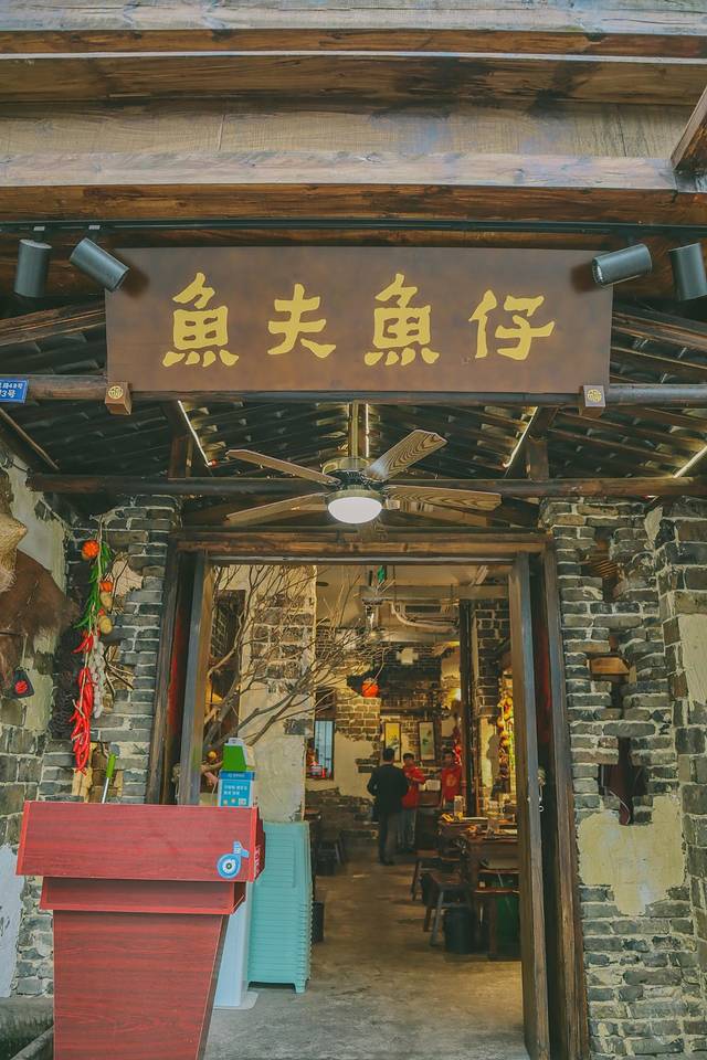 店内摆放的是木质板凳桌椅,装饰都是以木件为主,环境布置得像在渔民家。