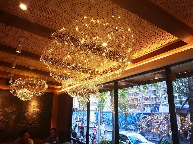 这家店的环境与其他家有些不同,小云朵一样的吊灯,看起来很现代,有落地橱窗,橱窗外面有绿色植物,整体看起来很别致。